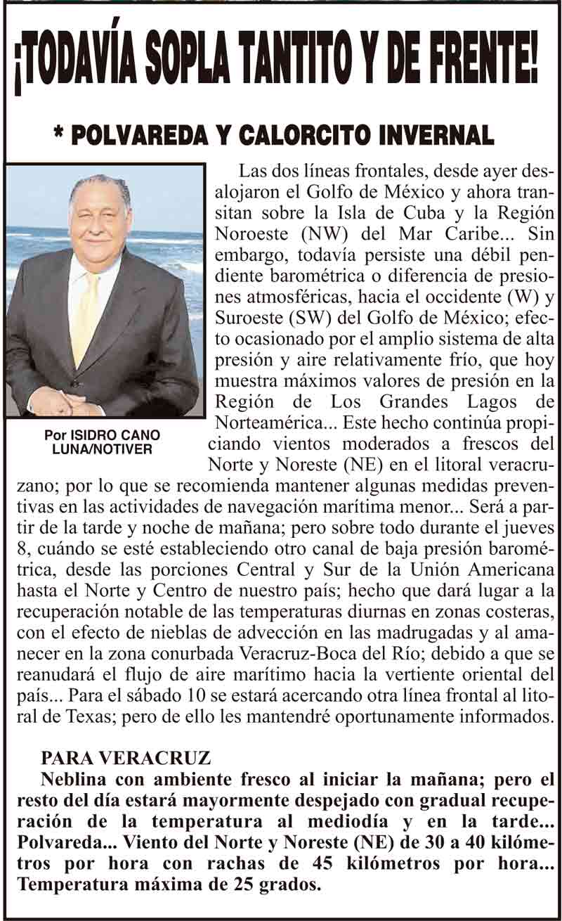 PRIMERA ¡TODAVÍA SOPLA TANTITO Y DE FRENTE! * POLVAREDA Y CALORCITO INVERNAL 6 febrero 2024 Más Noticias ¡LA PREMIAN EN LA UV! - A SÚPER ESTUDIANTE ¡ACATAN SENTENCIA! - CASO ASCENSIO ¡OPERATIVO “SALVAVIDAS”! ¡TAMBIÉN TAMBORES DE GUERRA! - UYUYYYY ¡VIRGILIO TORRES A TRÁNSITO! - *Era el segundo de Andrés Delgado, en la delegación de Medellín ¡EJECUTAN A LÍDER DE TAXISTAS! - EN ACAYUCAN ¡TIENEN MELLO! - AY NANITAS ¡CUMPLE MANDINGA 425 AÑOS! - *Viene un Príncipe de Camerún NOTI-MEME | - ''LOS GRINCHS'' LOS CARTONES