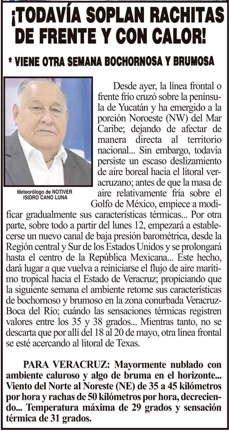 PRIMERA ¡TODAVÍA SOPLAN RACHITAS DE FRENTE Y CON CALOR! - *VIENE OTRA SEMANA BOCHORNOSA Y BRUMOSA 11 mayo 2025 Más Noticias ¡YA HAY TERNA! - RAÚL PEIMBERT EN LA LISTA ¡“CEMENTERIO”! - DE ULÚAS ¡INAUGURA PATY OTRA CALLE! ¡NO LE CREYERON! - Y LO BUSCAN NOTI-MEME | - ECOS DEL INFORME! ¡VERÓNICA VA CON NAHLE! - Y AL CONGRESO ¡“FAST TRACK”! - *Mientras el Mariner salía y entraba de Pajaritos en Coatzacoalcos ¡OPERATIVO LUPE-REYES! ¡MANDAN LA BILLETIZA! - *Corea manda 150 mil dólares ¡CRISTINA GANA LA ELECCIÓN!