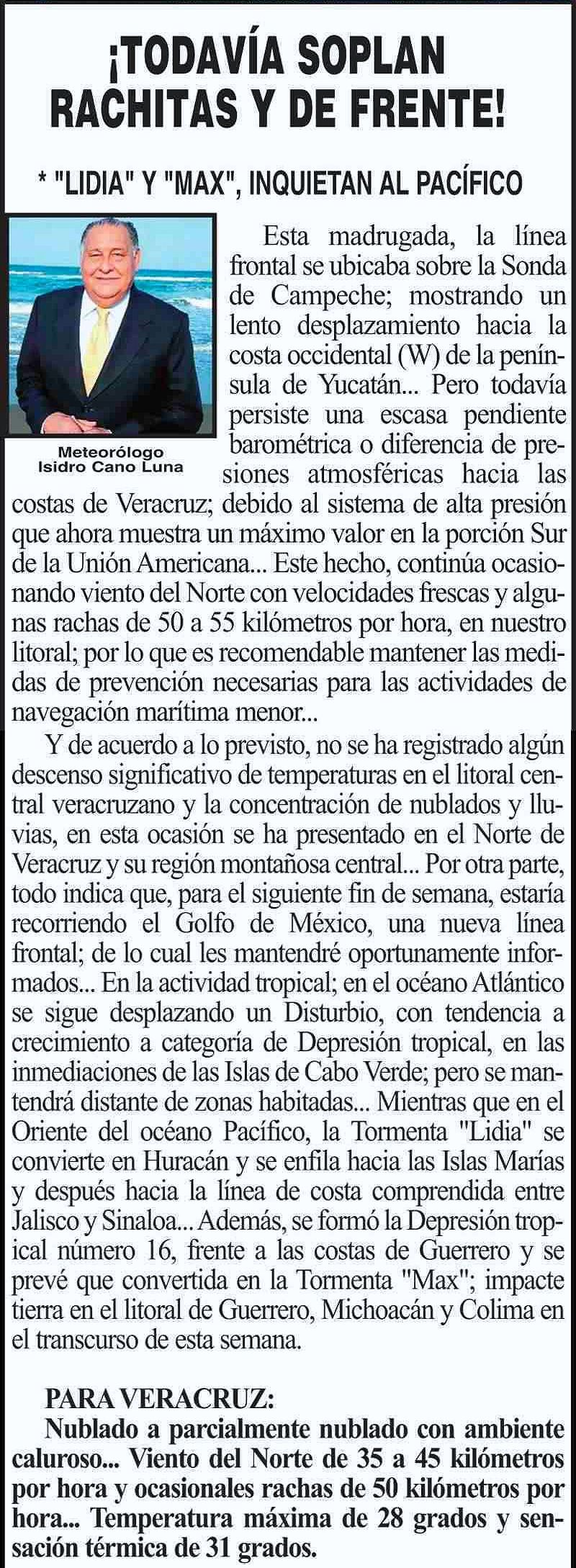 PRIMERA ¡TODAVÍA SOPLAN RACHITAS Y DE FRENTE! * "LIDIA" Y "MAX", INQUIETAN AL PACÍFICO 9 octubre 2023 Más Noticias ¡YA HAY TERNA! - RAÚL PEIMBERT EN LA LISTA ¡“CEMENTERIO”! - DE ULÚAS ¡INAUGURA PATY OTRA CALLE! ¡NO LE CREYERON! - Y LO BUSCAN NOTI-MEME | - ECOS DEL INFORME! ¡VERÓNICA VA CON NAHLE! - Y AL CONGRESO ¡“FAST TRACK”! - *Mientras el Mariner salía y entraba de Pajaritos en Coatzacoalcos ¡OPERATIVO LUPE-REYES! ¡MANDAN LA BILLETIZA! - *Corea manda 150 mil dólares ¡CRISTINA GANA LA ELECCIÓN!