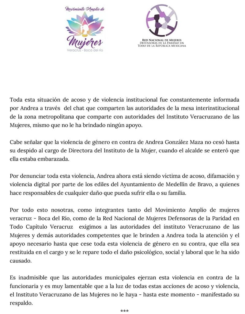 La Red Nacional de Mujeres Defensoras de la Paridad en Todo, Capítulo Veracruz, y el Movimiento Amplio de Mujeres Veracruz-Boca del Río condenaron las agresiones y presiones que llevaron a la salida de la directora del Instituto Municipal de las Mujeres del Ayuntamiento de Medellín de Bravo, Andrea González Maza.