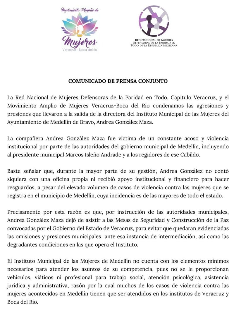 La Red Nacional de Mujeres Defensoras de la Paridad en Todo, Capítulo Veracruz, y el Movimiento Amplio de Mujeres Veracruz-Boca del Río condenaron las agresiones y presiones que llevaron a la salida de la directora del Instituto Municipal de las Mujeres del Ayuntamiento de Medellín de Bravo, Andrea González Maza.