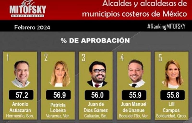 CIUDAD DE MÉXICO. (Agencias).- Juan Manuel Unánue Abascal continúa el año con una gran aceptación y es que de acuerdo a la prestigiada encuestadora Mitofsky se encuentra en la posición 4 de los alcaldes costeros con mejor desempeño y aprobación ciudadana a nivel nacional.