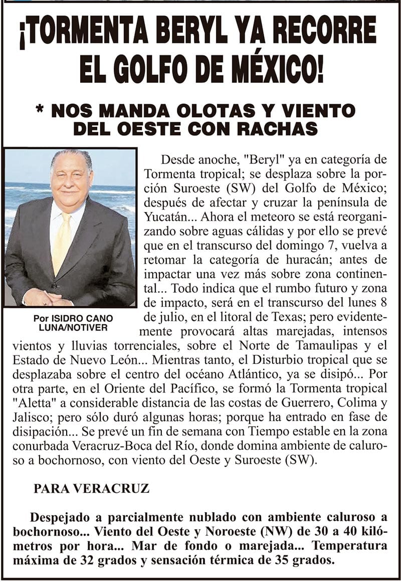 PRIMERA ¡TORMENTA BERYL YA RECORRE EL GOLFO DE MÉXICO! - *NOS MANDA OLOTAS Y VIENTO DEL OESTE CON RACHAS 6 julio 2024 Más Noticias ¡YA HAY TERNA! - RAÚL PEIMBERT EN LA LISTA ¡“CEMENTERIO”! - DE ULÚAS ¡INAUGURA PATY OTRA CALLE! ¡NO LE CREYERON! - Y LO BUSCAN NOTI-MEME | - ECOS DEL INFORME! ¡VERÓNICA VA CON NAHLE! - Y AL CONGRESO ¡“FAST TRACK”! - *Mientras el Mariner salía y entraba de Pajaritos en Coatzacoalcos ¡OPERATIVO LUPE-REYES! ¡MANDAN LA BILLETIZA! - *Corea manda 150 mil dólares ¡CRISTINA GANA LA ELECCIÓN!