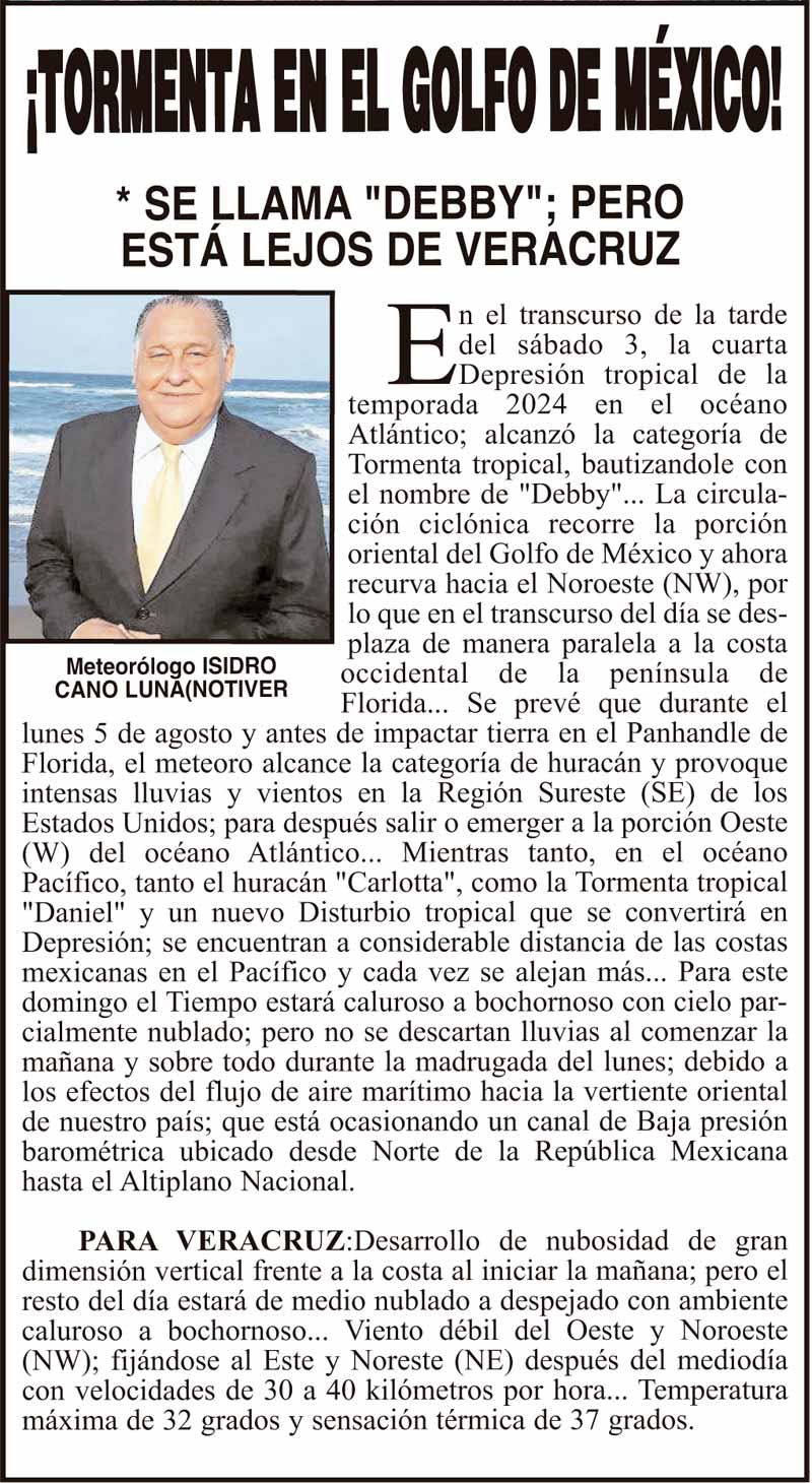 PRIMERA ¡TORMENTA EN EL GOLFO DE MÉXICO! - *SE LLAMA "DEBBY"; PERO ESTÁ LEJOS DE VERACRUZ 4 agosto 2024 Más Noticias ¡YA HAY TERNA! - RAÚL PEIMBERT EN LA LISTA ¡“CEMENTERIO”! - DE ULÚAS ¡INAUGURA PATY OTRA CALLE! ¡NO LE CREYERON! - Y LO BUSCAN NOTI-MEME | - ECOS DEL INFORME! ¡VERÓNICA VA CON NAHLE! - Y AL CONGRESO ¡“FAST TRACK”! - *Mientras el Mariner salía y entraba de Pajaritos en Coatzacoalcos ¡OPERATIVO LUPE-REYES! ¡MANDAN LA BILLETIZA! - *Corea manda 150 mil dólares ¡CRISTINA GANA LA ELECCIÓN!