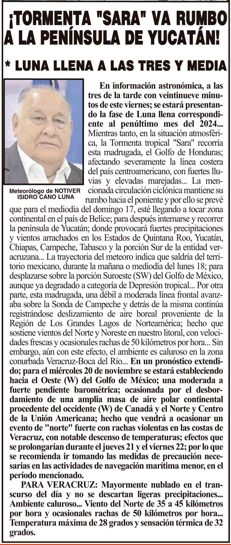PRIMERA ¡TORMENTA "SARA" VA RUMBO A LA PENÍNSULA DE YUCATÁN! - *LUNA LLENA A LAS TRES Y MEDIA 15 noviembre 2024 Más Noticias ¡CAZARÍN LE TRAJO LA BILLETIZA! - A LOS ABUELITOS ¡NO HAY AGUA EN OCHO COLONIAS! - *Por una fuga en la red ¡EJECUTAN A FOTÓGRAFO! - EN CÓRDOBA ¡SENTENCIA HISTÓRICA! - CASO ASCENCIO ¡OTRA CALLE MÁS! ¡MUERE DIEGO FERNÁNDEZ! - “EL PAMPANO” ¡FALLECE HERMANO DE REYNALDO! ¡METEN TIJERA! - MOLES ¡SE COLAPSÓ! - EL COCOTERO DE ÁLAMO LA ENCUESTA | - CATAPLÚM!