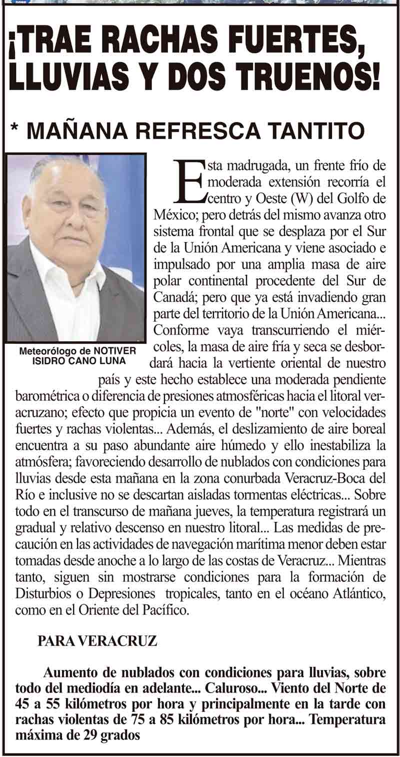 PRIMERA ¡TRAE RACHAS FUERTES, LLUVIAS Y DOS TRUENOS! - *MAÑANA REFRESCA TANTITO 20 noviembre 2024 Más Noticias ¡YA HAY TERNA! - RAÚL PEIMBERT EN LA LISTA ¡“CEMENTERIO”! - DE ULÚAS ¡INAUGURA PATY OTRA CALLE! ¡NO LE CREYERON! - Y LO BUSCAN NOTI-MEME | - ECOS DEL INFORME! ¡VERÓNICA VA CON NAHLE! - Y AL CONGRESO ¡“FAST TRACK”! - *Mientras el Mariner salía y entraba de Pajaritos en Coatzacoalcos ¡OPERATIVO LUPE-REYES! ¡MANDAN LA BILLETIZA! - *Corea manda 150 mil dólares ¡CRISTINA GANA LA ELECCIÓN!