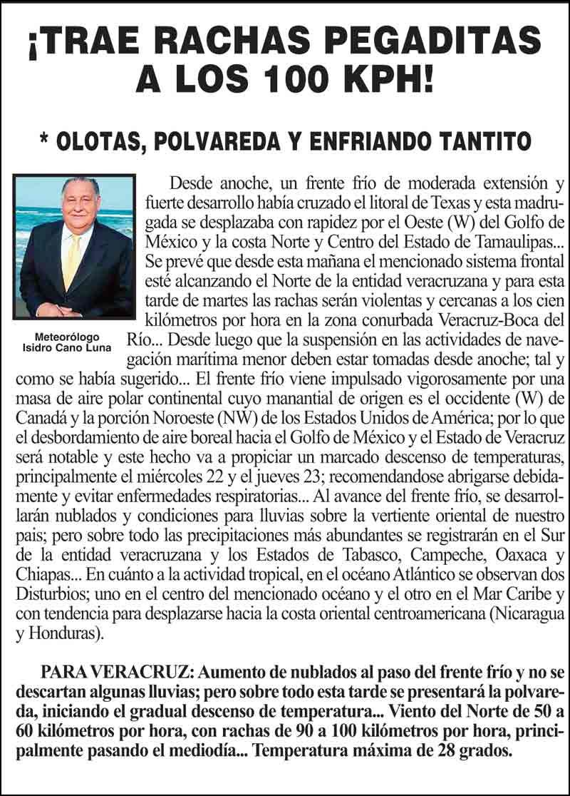 PRIMERA ¡TRAE RACHAS PEGADITAS A LOS 100 KPH! *OLOTAS, POLVAREDA Y ENFRIANDO TANTITO 21 noviembre 2023 Más Noticias ¡YA HAY TERNA! - RAÚL PEIMBERT EN LA LISTA ¡“CEMENTERIO”! - DE ULÚAS ¡INAUGURA PATY OTRA CALLE! ¡NO LE CREYERON! - Y LO BUSCAN NOTI-MEME | - ECOS DEL INFORME! ¡VERÓNICA VA CON NAHLE! - Y AL CONGRESO ¡“FAST TRACK”! - *Mientras el Mariner salía y entraba de Pajaritos en Coatzacoalcos ¡OPERATIVO LUPE-REYES! ¡MANDAN LA BILLETIZA! - *Corea manda 150 mil dólares ¡CRISTINA GANA LA ELECCIÓN!