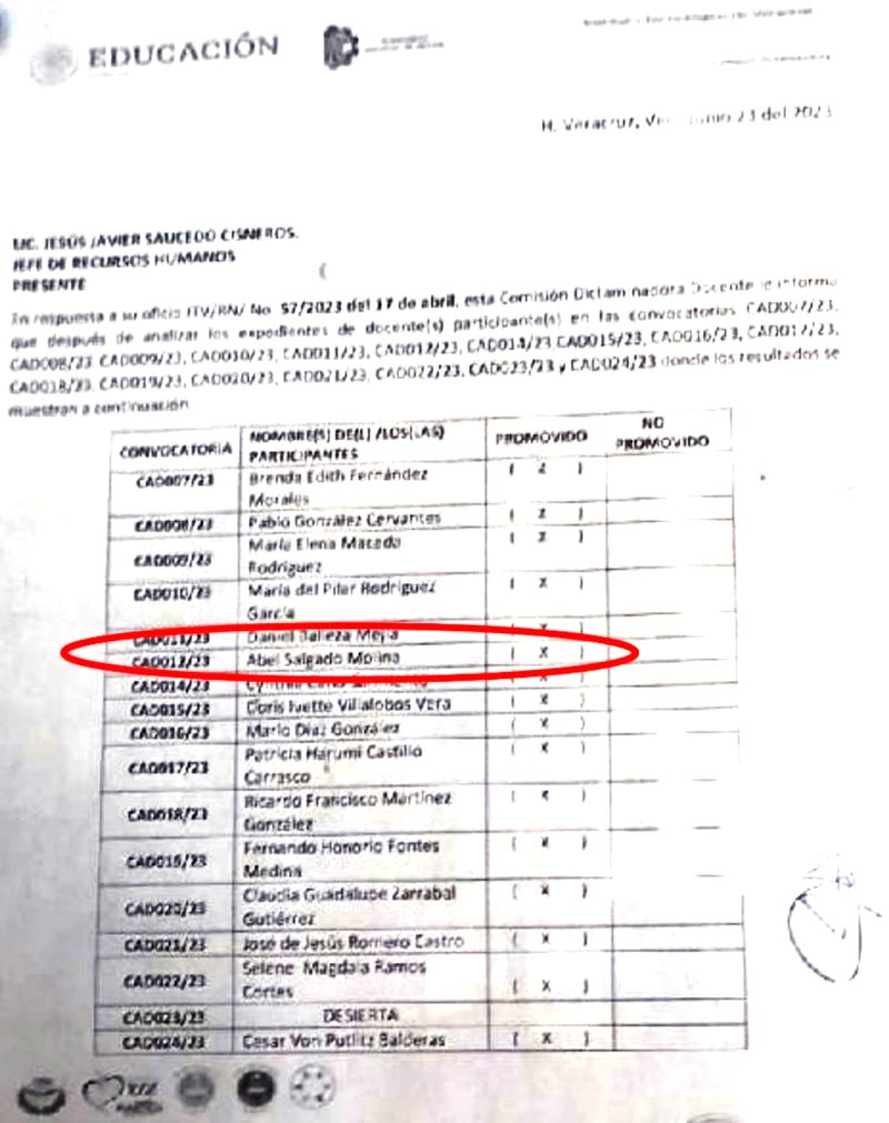 Bajo ese esquema de corrupción se asignó una plaza a Abel Salgado Molina, hijo del director del ITV, así como a hijos y sobrinos del sec-retario general de la Delegación D-V 113, Sección 61 del SNTE, dejando fuera a catedráticos que sí cumplían con todos los requisitos establecidos en las convocatorias.