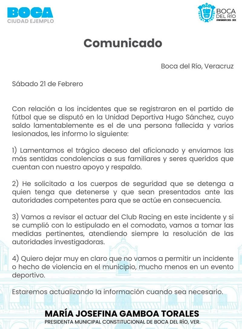 Con relación a los incidentes que se registraron en el partido de futbol que se disputó en la Unidad Deportiva Hugo Sánchez, cuyo saldo lamentablemente es el de una persona fallecida y varios lesionados, les informo lo siguiente:
