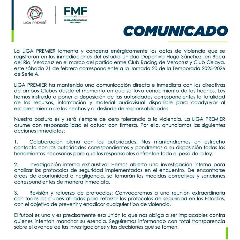 1) Lamentamos el trágico deceso del aficionado y enviamos las más sentidas condolencias a sus familiares y seres queridos que cuentan con nuestro apoyo y respaldo.