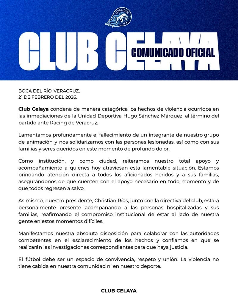 A causa de la golpiza propinada por porristas del Racing de Veracruz murió el porrista de los Toros del Celaya, Carlos Alberto Ortiz Lara (a) El Biyik, el cual quedó tendido sobre el pavimento, ya sin signos vitales, así lo reportó la policía de la SSP.