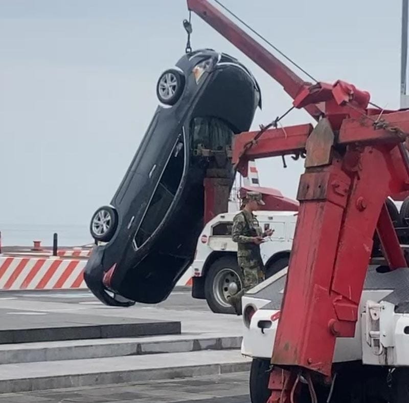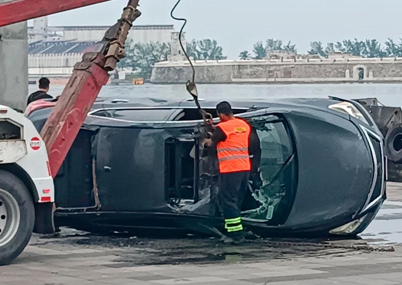 No obstante ahí está obstruido el acceso, entonces al echarse de reversa para volver, una llanta trasera llegó a las escaleras del Muelle de la T por lo que de forma inminente el auto terminó en el agua.