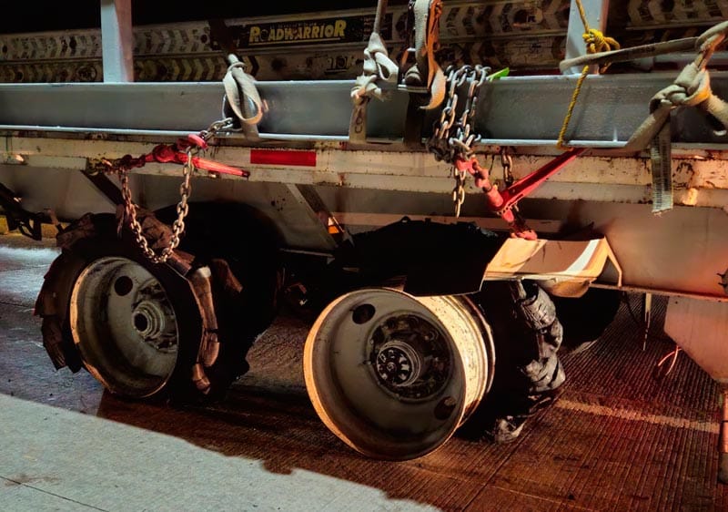 Pese a que habían ponchado varias, el sujeto no detenía su marcha por lo que iba circulando sobre los rines, hasta que por fin lograron darles a los neumáticos delanteros lo que detuvo el tráiler frente al mercado.