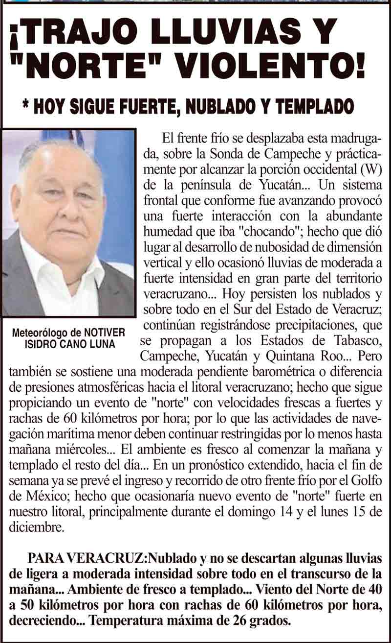 PRIMERA ¡TRAJO LLUVIAS Y "NORTE" VIOLENTO! - *HOY SIGUE FUERTE, NUBLADO Y TEMPLADO 9 diciembre 2025 Más Noticias ¡QUE “GANÓ MÉXICO”! - Y EL REJONEADOR... ¡ABREN EL “PIRATA”! ¡TODO EL PESO...! - ACTIVISTAS CONTRA REJONEADOR ¡SIGUE EL CHAPO EN EL MAR! - ÁNDALE - *Denuncia la Red Corredor Arrecifal del Golfo de México ¡SÍ TIENE VISA! - CHIKY-YUNES - *“Mi visa está vigente. Viajé en enero y no tuve ningún problema”, dijo ¡ESPANTAN EN EL MALECÓN! - *Señalan que los gritos pudieron quedarse atrapados en los muelles ¡RESCATAN TAPACAMINOS! - ¡MEGA-APAGÓN! - EN VERACRUZ, BOCA DEL RÍO, MEDELLÍN Y ALVARADO NOTI-MEME ¡PROTESTAN EN LA ESCUELA! - EN LA “ARROYO FLORES”