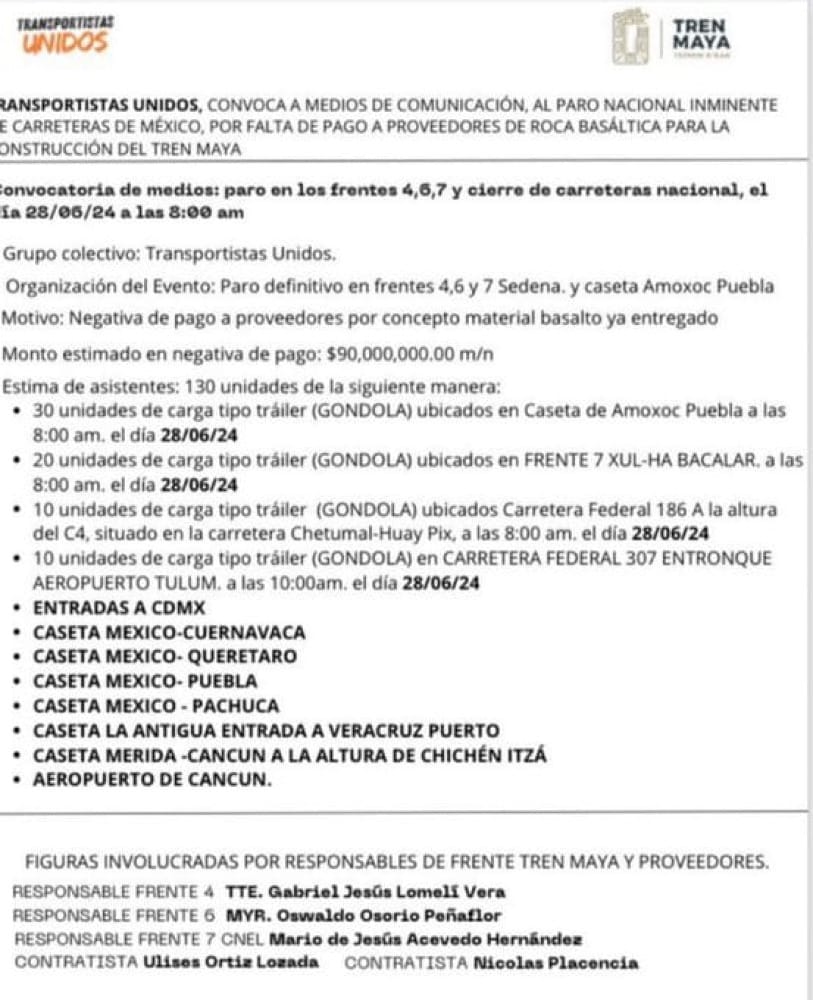 La organización Transportistas Unidos convocó a un paro nacional en carreteras de México debido a la falta de pago a proveedores de roca basáltica para la construcción del Tren Maya.