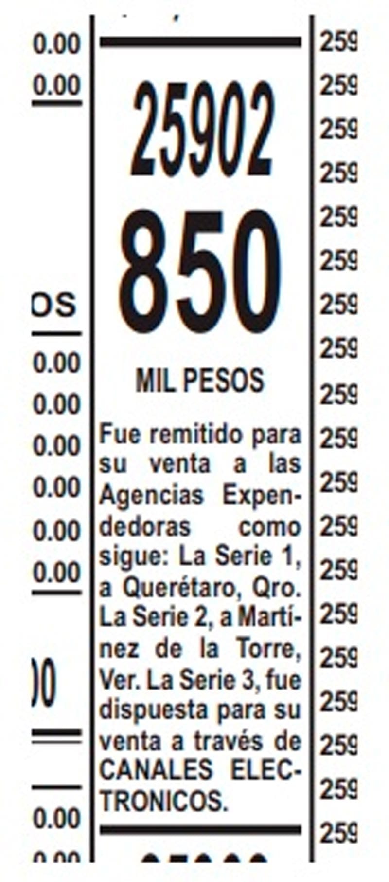 Ahora fue el número 25 902 que se hizo acreedor a 850 mil pesos, se indica que fue remitido para su venta a las agencias expendedoras como sigue: