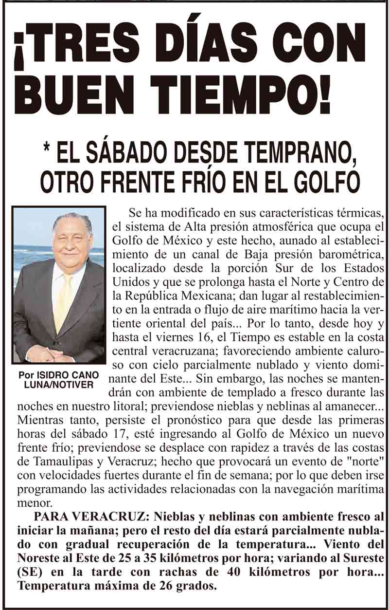PRIMERA ¡TRES DÍAS CON BUEN TIEMPO! * EL SÁBADO DESDE TEMPRANO, OTRO FRENTE FRÍO EN EL GOLFO 14 febrero 2024 Más Noticias ¡YA HAY TERNA! - RAÚL PEIMBERT EN LA LISTA ¡“CEMENTERIO”! - DE ULÚAS ¡INAUGURA PATY OTRA CALLE! ¡NO LE CREYERON! - Y LO BUSCAN NOTI-MEME | - ECOS DEL INFORME! ¡VERÓNICA VA CON NAHLE! - Y AL CONGRESO ¡“FAST TRACK”! - *Mientras el Mariner salía y entraba de Pajaritos en Coatzacoalcos ¡OPERATIVO LUPE-REYES! ¡MANDAN LA BILLETIZA! - *Corea manda 150 mil dólares ¡CRISTINA GANA LA ELECCIÓN!