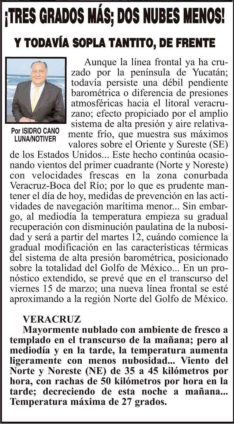 PRIMERA ¡TRES GRADOS MÁS; DOS NUBES MENOS! - *Y TODAVÍA SOPLA TANTITO, DE FRENTE 11 marzo 2024 Más Noticias ¡YA HAY TERNA! - RAÚL PEIMBERT EN LA LISTA ¡“CEMENTERIO”! - DE ULÚAS ¡INAUGURA PATY OTRA CALLE! ¡NO LE CREYERON! - Y LO BUSCAN NOTI-MEME | - ECOS DEL INFORME! ¡VERÓNICA VA CON NAHLE! - Y AL CONGRESO ¡“FAST TRACK”! - *Mientras el Mariner salía y entraba de Pajaritos en Coatzacoalcos ¡OPERATIVO LUPE-REYES! ¡MANDAN LA BILLETIZA! - *Corea manda 150 mil dólares ¡CRISTINA GANA LA ELECCIÓN!