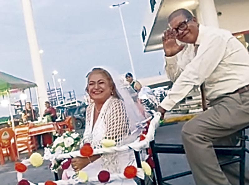 Una pareja de adultos mayores festejaron sus Bodas de Plata en Tejería, en la ciudad de Veracruz, como no había para llegar al altar en auto, Don Arturo llevó a la iglesia a Doña Chabe en un triciclo