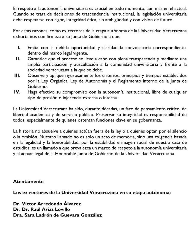 Por estas razones, los ex rectores de la etapa autónoma de la Universidad Veracruzana exhortaron con firmeza a su Junta de Gobierno a que: Emita la convocatoria correspondiente; garantice que el proceso se lleve a cabo con plena transparencia y mediante una amplia participación y auscultación;observe y aplique rigurosamente los criterios, principios y tiempos establecidos por la Ley Orgánica y haga efectivo su compromiso con la autonomía institucional, libre de cualquier tipo de presión o injerencia externa o interna.