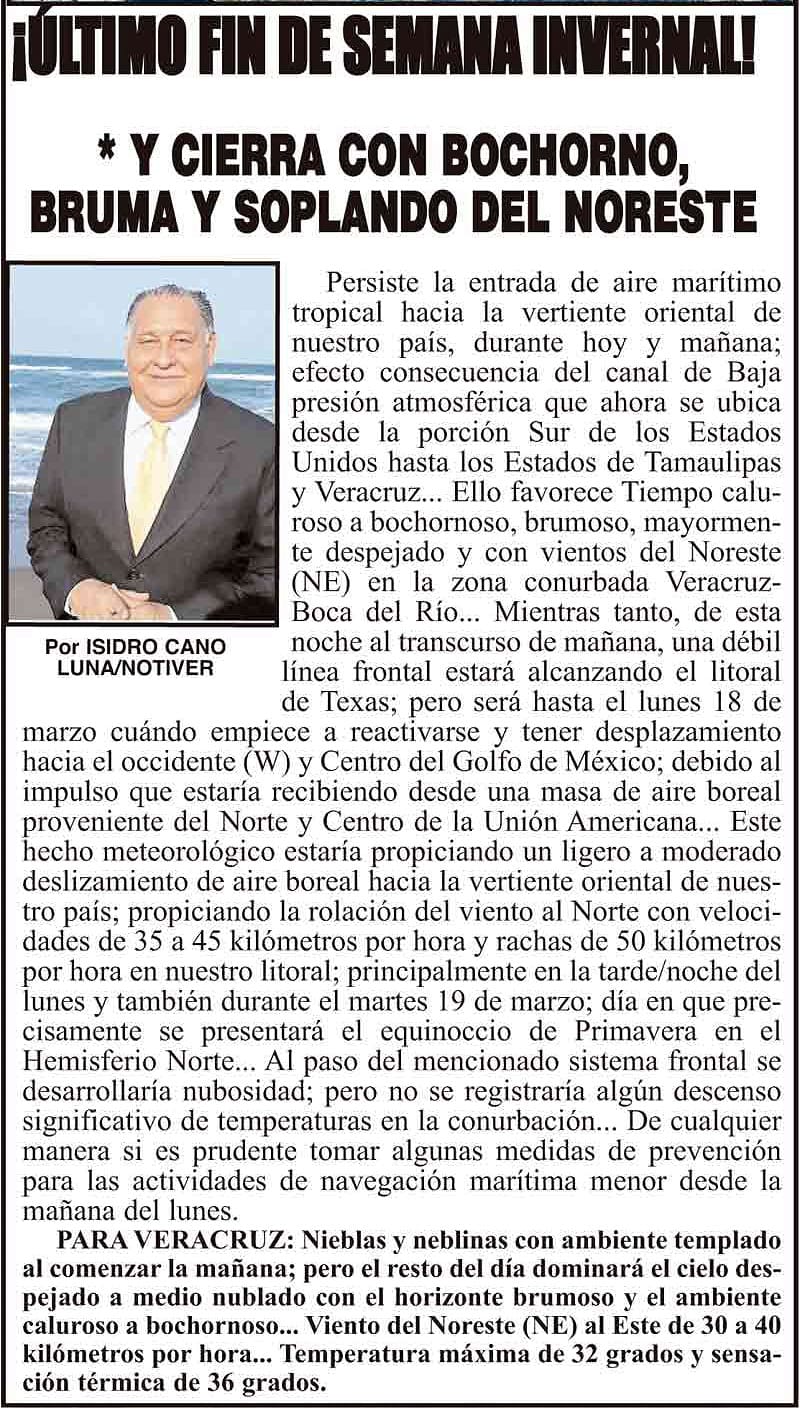 PRIMERA ¡ÚLTIMO FIN DE SEMANA INVERNAL! - * Y CIERRA CON BOCHORNO, BRUMA Y SOPLANDO DEL NORESTE 16 marzo 2024 Más Noticias ¡COMIENZA “PONTE OREJA”! - *100 boqueños beneficiados con estudios de audiometría ¡NI UNA BOMBA MÁS! - POR AHORA... ¡CAMBIOS EN LA CANACAR! ¡PELÍCANOS MUERTOS! - ALERTAN CONTAMINACIÓN ¡VA LA UV! - AL OBSERVATORIO ¡CARAMBOLA TRÁGICA! - EN LAS CUMBRES ¡PARAN LOS QUETZALLI! - *Operadores realizaron paro parcial por jornadas de casi 20 horas y bajos pagos ¡SE VAN A ASTURIAS! ¡MANIOBRISTAS VS. PULIDO! - YA SE ARMÓ ¡CHAPOPOTAZO! - PA’SUMECHA