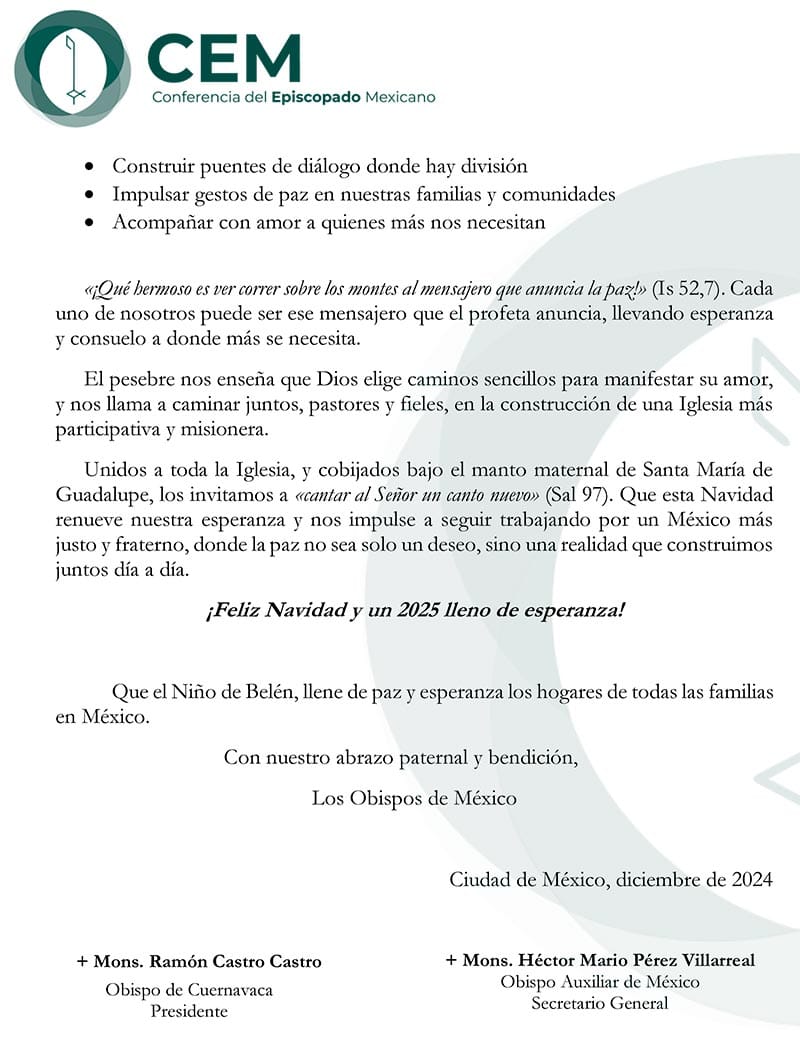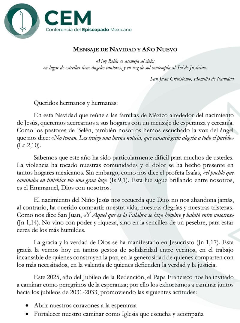 Este sábado la Conferencia del Episcopado Mexicano emitió su mensaje de Navidad y año Nuevo por parte de los obispos de México, en donde acentúan que ha sido particularmente un año difícil, en donde la violencia ha tocado a las comunidades y el dolor se ha hecho presente en muchos hogares mexicanos, dijeron.