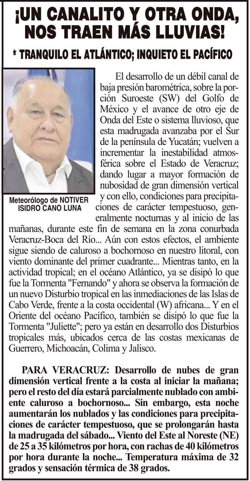 PRIMERA ¡UN CANALITO Y OTRA ONDA, NOS TRAEN MÁS LLUVIAS! - *TRANQUILO EL ATLÁNTICO; INQUIETO EL PACÍFICO 29 agosto 2025 Más Noticias LA ENCUESTA | - ME ESTÁS OYENDO INÚTIL?... ¡CON BAILONGOS QUIEREN AYUDAR A LOS DAMNIFICADOS DEL NORTE! - *El mismo Alor, toca los timbales ¡YA SE LA APROBARON! - REFORMA PARA LA FISCALÍA ESTATAL NOTI-MEME | - ASÍ ESTUVO EL INFORME... ¡MÁS DE 9 MIL MILLONES! - *Eso costaría cancelar en Veracruz al Grupo MAS ¡LE DAN LUZ VERDE! - DESDE GUATEMALA ¡EL CUARTO! ¡Y COM-PA-RE-CIÓ! - ÁNDALE... ¡NO SE VA LISBETH AURELIA! - *Descarta ir a la Fiscalía y que seguirá como magistrada ¡CREAN EL SÚPER MAÍZ!