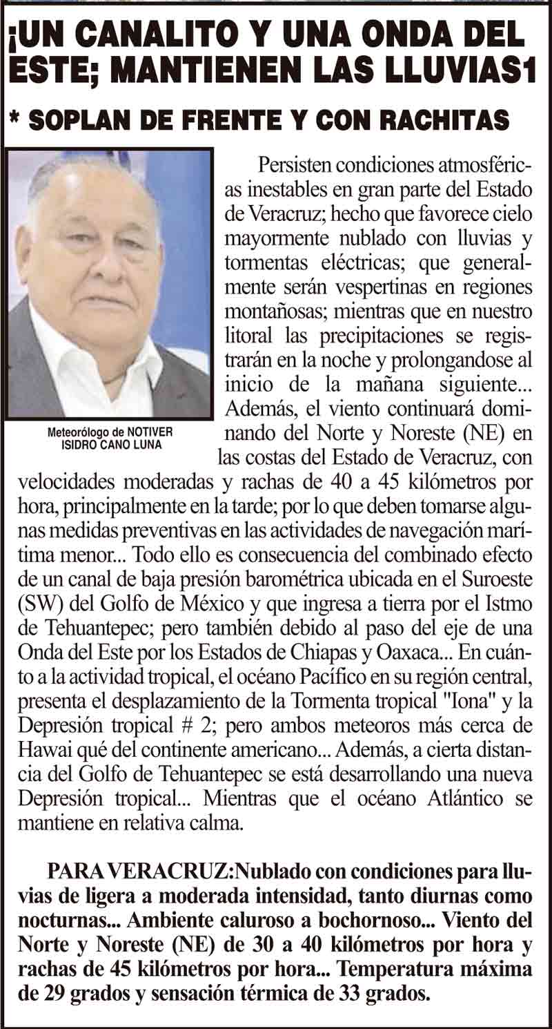 PRIMERA ¡UN CANALITO Y UNA ONDA DEL ESTE; MANTIENEN LAS LLUVIAS! - *SOPLAN DE FRENTE Y CON RACHITAS 29 julio 2025 Más Noticias ¡PARAN EN LA UPAV! - *300 estudiantes sin clases ¡MULTADOS! - *PAN el más castigado con 6 millones ¡HOTELEROS Y AGENCIAS DE VIAJES SE LA FIRMAN! LOS CARTONES ¡QUIEREN A ROCHA Y 9 MÁS! - EN LA CORTE DE NUEVA YORK ¡REBELIÓN DE PESCADORES! - Y PARAN EL NORTE ¡ENCUENTRAN A LA MAESTRA! - DESAPARECIDA EN LA INUNDACIÓN EN ILAMATLÁN MARYJOSE VS. CAB! ¡CUI SE PLACEA EN PALACIO! - *Ni así y lo mandan hasta Gayola LA ENCUESTA | - LO QUIERE TRUMP!