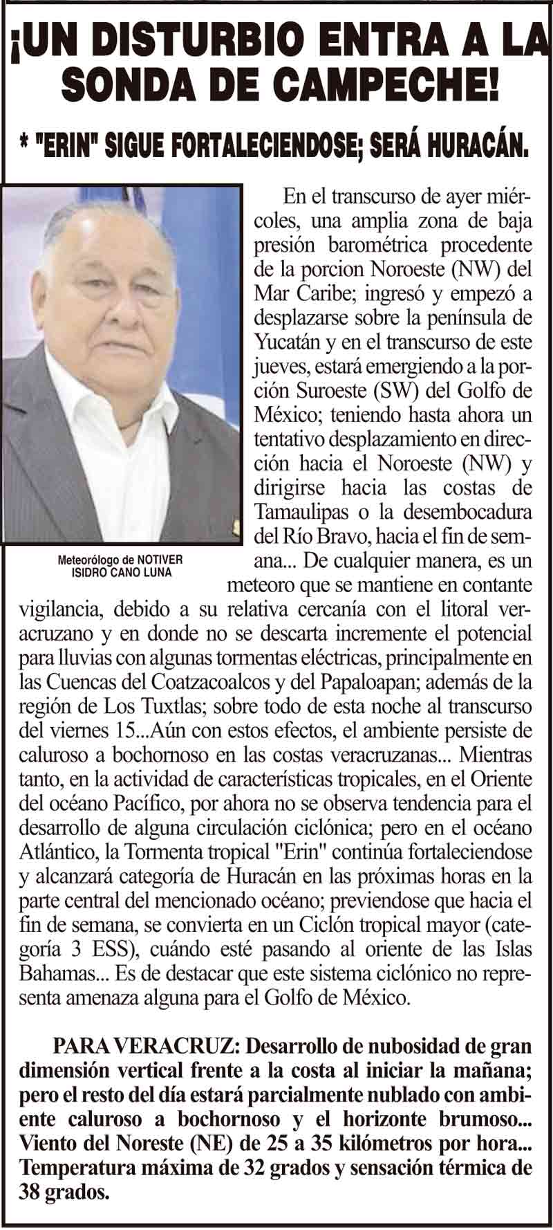 PRIMERA ¡UN DISTURBIO ENTRA A LA SONDA DE CAMPECHE! - * "ERIN" SIGUE FORTALECIENDOSE; SERÁ HURACÁN. 14 agosto 2025 Más Noticias ¡HOY SOPLA FRESCO Y DE FRENTE! - *PERO EL LUNES 8, ESTARÁ FUERTE Y CON LLUVIAS. LA ENCUESTA | - ME ESTÁS OYENDO INÚTIL?... ¡CON BAILONGOS QUIEREN AYUDAR A LOS DAMNIFICADOS DEL NORTE! - *El mismo Alor, toca los timbales ¡YA SE LA APROBARON! - REFORMA PARA LA FISCALÍA ESTATAL NOTI-MEME | - ASÍ ESTUVO EL INFORME... ¡MÁS DE 9 MIL MILLONES! - *Eso costaría cancelar en Veracruz al Grupo MAS ¡LE DAN LUZ VERDE! - DESDE GUATEMALA ¡EL CUARTO! ¡Y COM-PA-RE-CIÓ! - ÁNDALE... ¡NO SE VA LISBETH AURELIA! - *Descarta ir a la Fiscalía y que seguirá como magistrada