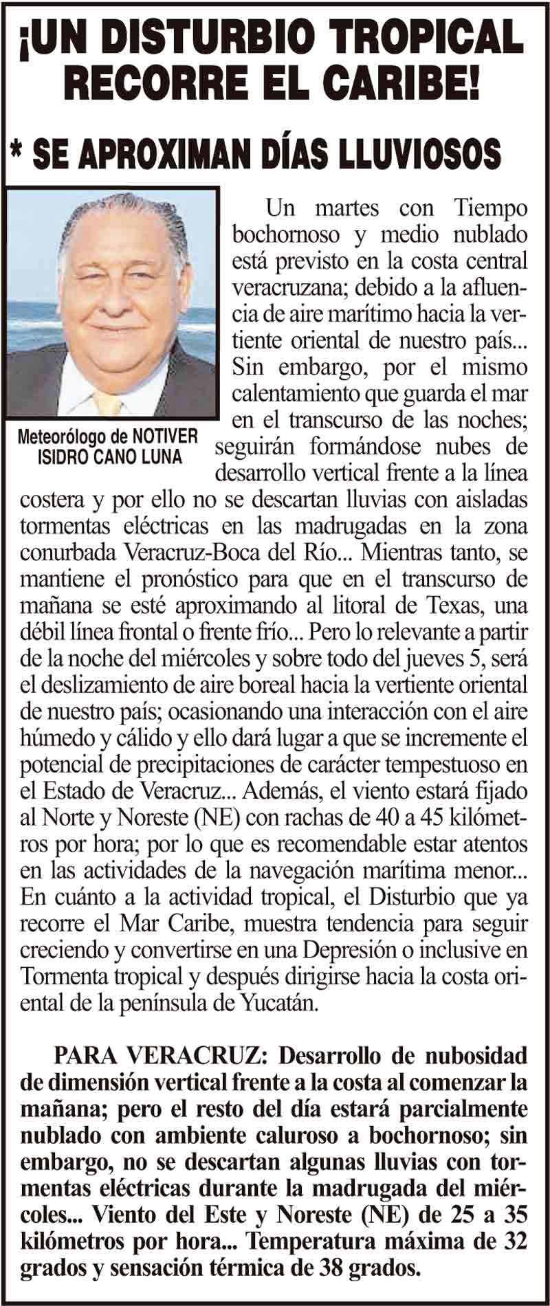 PRIMERA ¡UN DISTURBIO TROPICAL RECORRE EL CARIBE! - *SE APROXIMAN DÍAS LLUVIOSOS 3 septiembre 2024 Más Noticias ¡YA HAY TERNA! - RAÚL PEIMBERT EN LA LISTA ¡“CEMENTERIO”! - DE ULÚAS ¡INAUGURA PATY OTRA CALLE! ¡NO LE CREYERON! - Y LO BUSCAN NOTI-MEME | - ECOS DEL INFORME! ¡VERÓNICA VA CON NAHLE! - Y AL CONGRESO ¡“FAST TRACK”! - *Mientras el Mariner salía y entraba de Pajaritos en Coatzacoalcos ¡OPERATIVO LUPE-REYES! ¡MANDAN LA BILLETIZA! - *Corea manda 150 mil dólares ¡CRISTINA GANA LA ELECCIÓN!