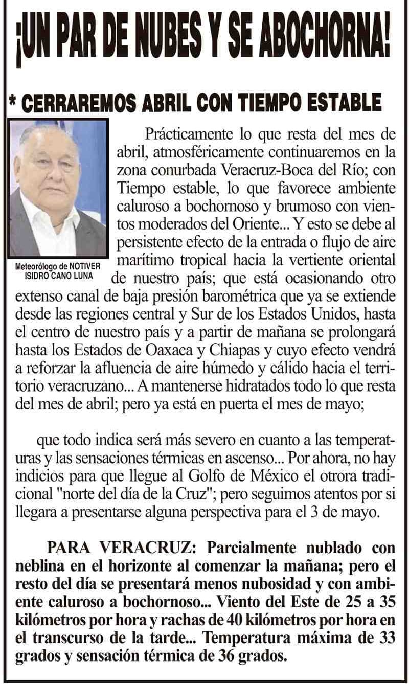 PRIMERA ¡UN PAR DE NUBES Y SE ABOCHORNA! - *CERRAREMOS ABRIL CON TIEMPO ESTABLE 23 abril 2025 Más Noticias ¡LA PREMIAN EN LA UV! - A SÚPER ESTUDIANTE ¡ACATAN SENTENCIA! - CASO ASCENSIO ¡OPERATIVO “SALVAVIDAS”! ¡TAMBIÉN TAMBORES DE GUERRA! - UYUYYYY ¡VIRGILIO TORRES A TRÁNSITO! - *Era el segundo de Andrés Delgado, en la delegación de Medellín ¡EJECUTAN A LÍDER DE TAXISTAS! - EN ACAYUCAN ¡TIENEN MELLO! - AY NANITAS ¡CUMPLE MANDINGA 425 AÑOS! - *Viene un Príncipe de Camerún NOTI-MEME | - ''LOS GRINCHS'' LOS CARTONES