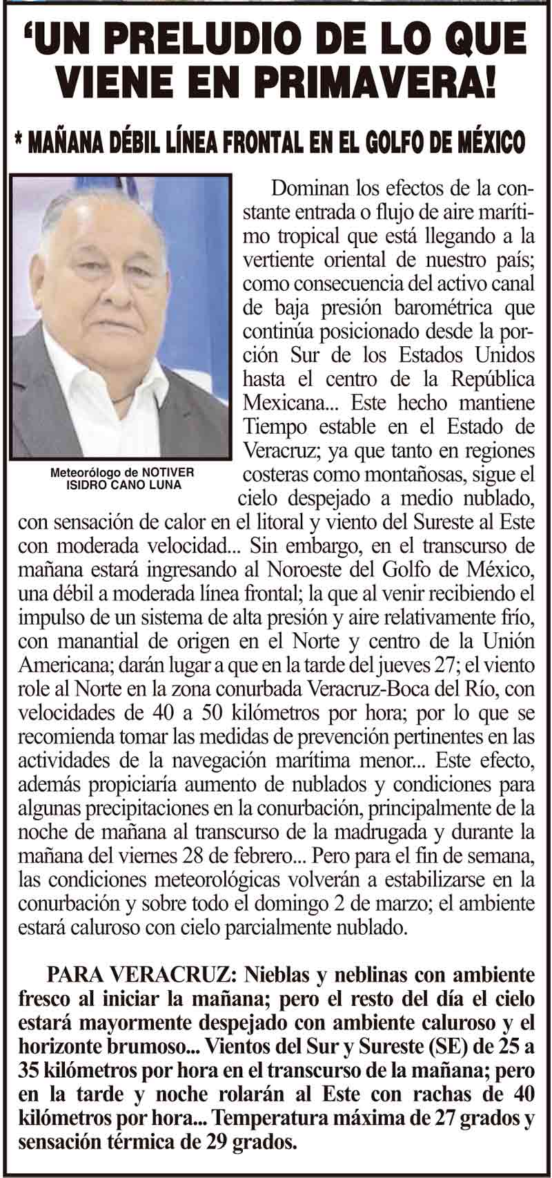 PRIMERA ‘UN PRELUDIO DE LO QUE VIENE EN PRIMAVERA! - *MAÑANA DÉBIL LÍNEA FRONTAL EN EL GOLFO DE MÉXICO 26 febrero 2025 Más Noticias ¡BLOQUEO DEL SECTOR SALUD EN PLAN DE RÍO! ¡TRAGEDIA EN LA AUTOPISTA VERACRUZ–XALAPA! NOTI-MEME | - YA LLEGÓ LA RAMA! LA ENCUESTA | - YA VIENE! ¡RECONOCIMIENTO A DIRIGENTE DE TAXISTAS! ¡LE VAN A ENTRAR! - *Claudia ordena a Nahle ¡QUIEREN MANDOS DE LA MARINA! - EN LAS POLICÍAS MUNICIPALES ¡ATACA EL VIRUS COXSACKIE, HAY 71 CASOS! - *Con mayor incidencia en 2025 y casos concentrados en Xalapa y Veracruz LOS CARTONES ¡SALMA SACA VIDEO! - RETEMUNDIAL...