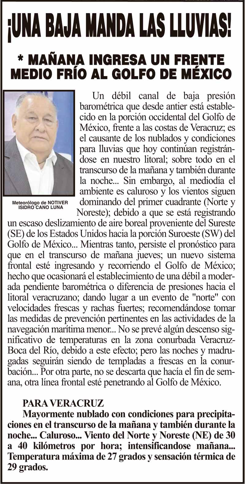 PRIMERA ¡UNA BAJA MANDA LAS LLUVIAS! - *MAÑANA INGRESA UN FRENTE MEDIO FRÍO AL GOLFO DE MÉXICO 18 diciembre 2024 Más Noticias ¡YA TIENE PUENTAZO EL SEGURO! ¡LA CARTELERA! | LA ÚLTIMA Y NOS VAMOS - De vacaciones andamos en Papantla, Veracruz, y en días pasados escuchamos dos charlas sobre los exploradores y la iconografía del basamento de los Nichos y El Tajín, en el Museo Teodoro Cano… ¡MAESTROS TENDRÁN BONO Y AGUINALDO! ¡LES MOCHAN EL AGUA A RÍO MEDIO! - *Por mantenimiento ¡SALE HUMO DE LAS ALCANTARILLAS! - *Explosiones en Jardines de Mocambo ¡LEY GARROTE! - *Paguen ya impuestos o van multas ¡YA TIENE MURAL TITO NIEVES! ¡PRESENTA LOTERÍA NACIONAL EL ÁLBUM DEL MUNDIAL! LOS CARTONES ¡PREVENCIONES PARA EVITAR EL INCREMENTO DE LAS INFECCIONES RESPIRATORIAS AGUADAS!