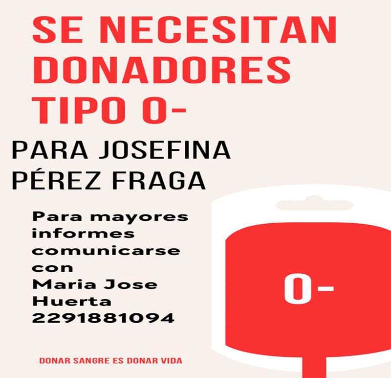 De acuerdo a la indicación se necesitan donadores tipo "O" negativo y para mayores informes hay que comunicarse con María José Huerta, al teléfono 2291 881094.