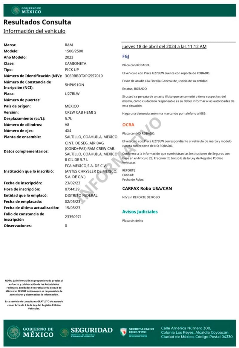 Sin embargo, eso no fue todo, más tarde, el transportista publicó que otra camioneta, ahora una tipo RAM, que usan en la misma caravana, cuenta con reporte de robo.