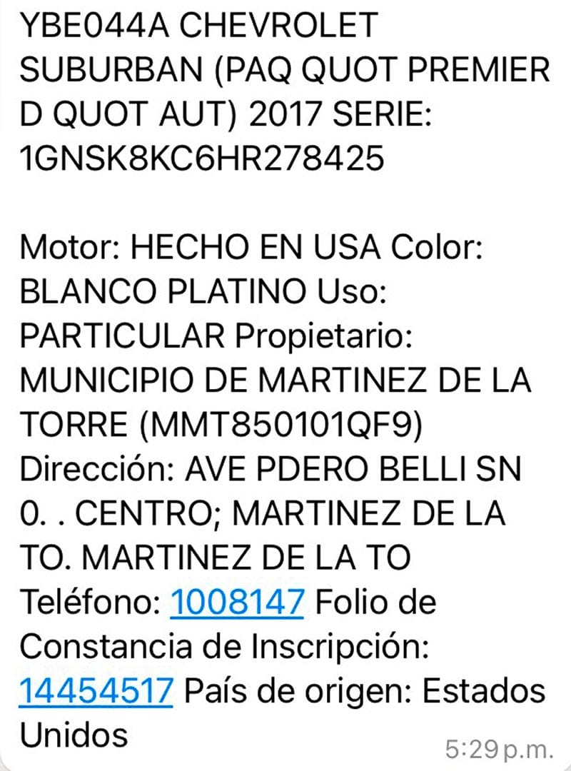 El denunciante publicó hasta la factura de la unidad Suburban 4X4, automática, que está a nombre de ese municipio citrícola, gobernado por el morenista, y que actualmente es alcalde con licencia, permiso que pidió para irse a la campaña de la oriunda de Zacatecas.