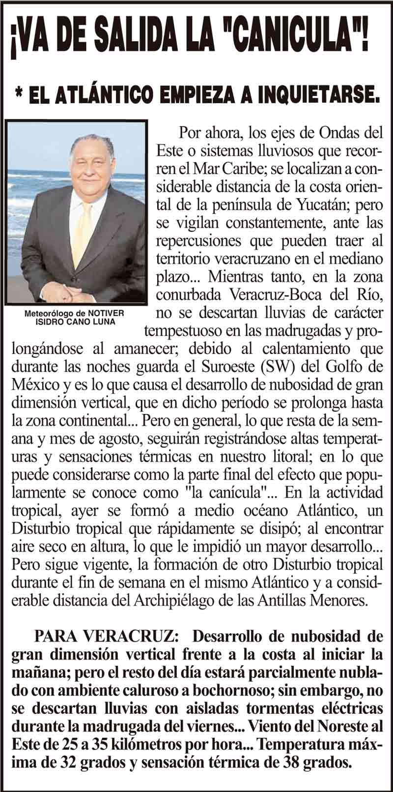 PRIMERA ¡VA DE SALIDA LA "CANICULA"! - *EL ATLÁNTICO EMPIEZA A INQUIETARSE. 29 agosto 2024 Más Noticias ¡YA HAY TERNA! - RAÚL PEIMBERT EN LA LISTA ¡“CEMENTERIO”! - DE ULÚAS ¡INAUGURA PATY OTRA CALLE! ¡NO LE CREYERON! - Y LO BUSCAN NOTI-MEME | - ECOS DEL INFORME! ¡VERÓNICA VA CON NAHLE! - Y AL CONGRESO ¡“FAST TRACK”! - *Mientras el Mariner salía y entraba de Pajaritos en Coatzacoalcos ¡OPERATIVO LUPE-REYES! ¡MANDAN LA BILLETIZA! - *Corea manda 150 mil dólares ¡CRISTINA GANA LA ELECCIÓN!