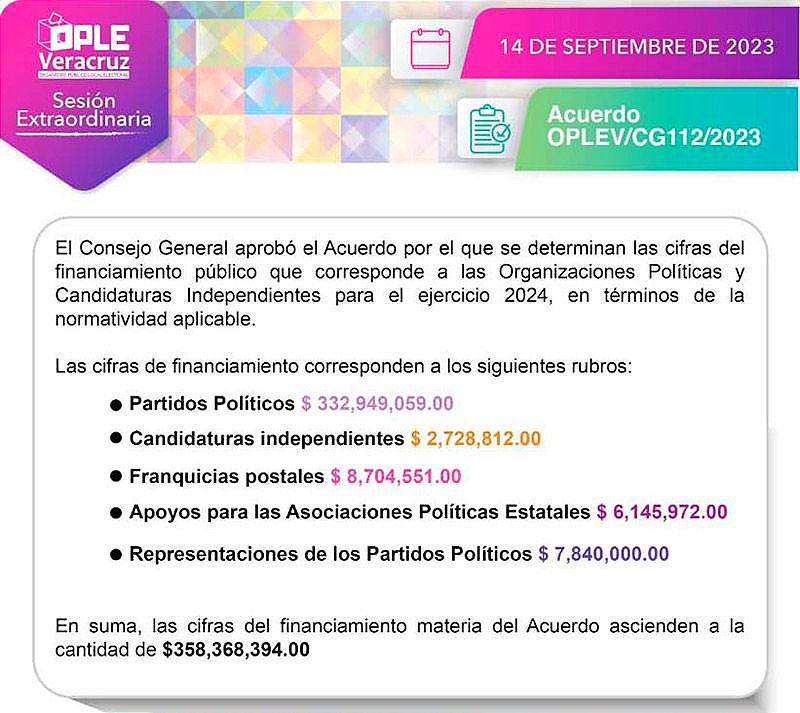 El Consejo General del Organismo Público Local Electoral (OPLE) proyectó para el 2024 un financiamiento público de 358 millones 368 mil 394.