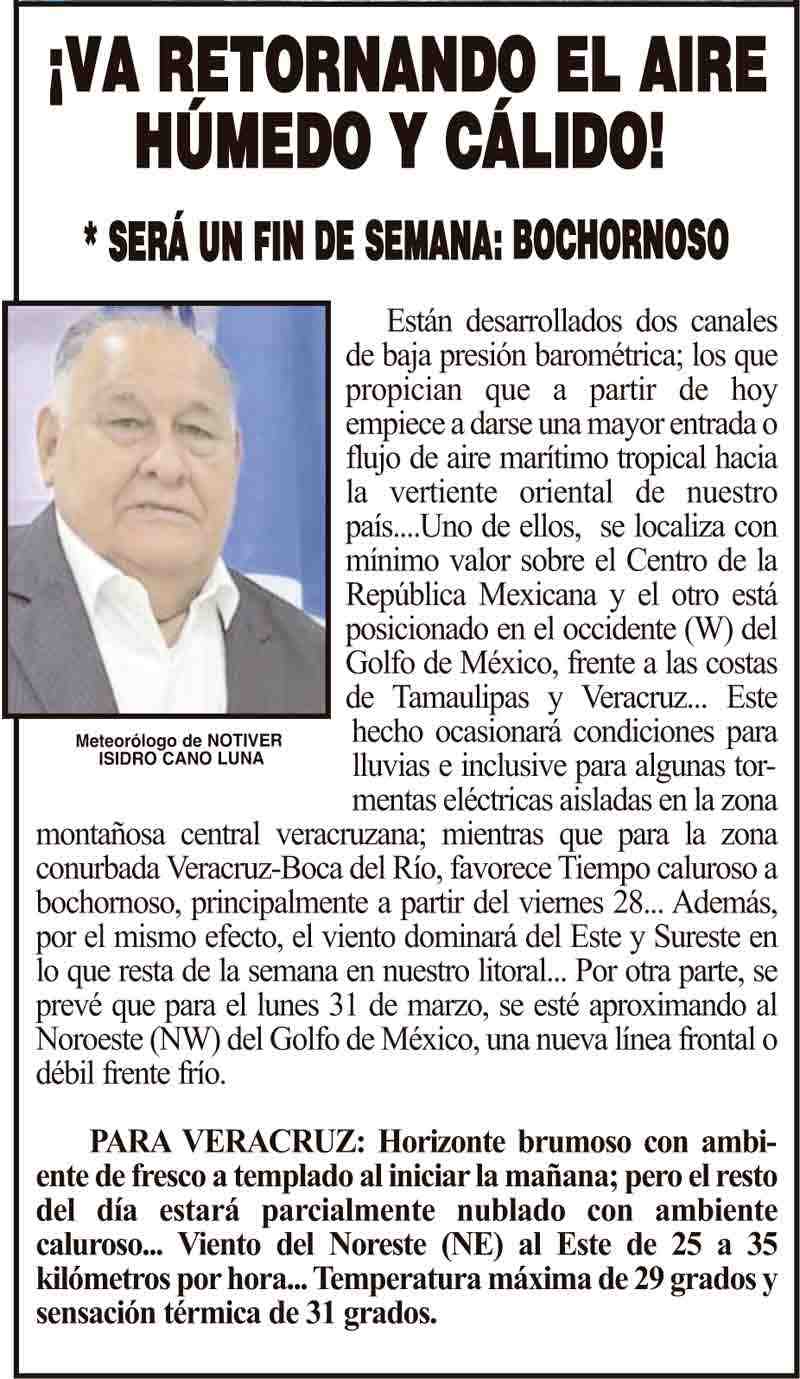 PRIMERA ¡VA RETORNANDO EL AIRE HÚMEDO Y CÁLIDO! - *SERÁ UN FIN DE SEMANA: BOCHORNOSO 26 marzo 2025 Más Noticias ¡SE NUBLA Y LLUEVE CON DOS RAYOS Y NORTECITO! - *PERO MAÑANA DESPEJA Y ACALORA ¡LA PREMIAN EN LA UV! - A SÚPER ESTUDIANTE ¡ACATAN SENTENCIA! - CASO ASCENSIO ¡OPERATIVO “SALVAVIDAS”! ¡TAMBIÉN TAMBORES DE GUERRA! - UYUYYYY ¡VIRGILIO TORRES A TRÁNSITO! - *Era el segundo de Andrés Delgado, en la delegación de Medellín ¡EJECUTAN A LÍDER DE TAXISTAS! - EN ACAYUCAN ¡TIENEN MELLO! - AY NANITAS ¡CUMPLE MANDINGA 425 AÑOS! - *Viene un Príncipe de Camerún NOTI-MEME | - ''LOS GRINCHS''