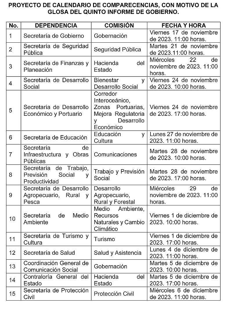 La Secretaría de Turismo y Cultura realizará su comparecencia ese mismo día, el viernes 01 de diciembre de 2023, pero a las 17:00 horas, ante la Comisión de Turismo.