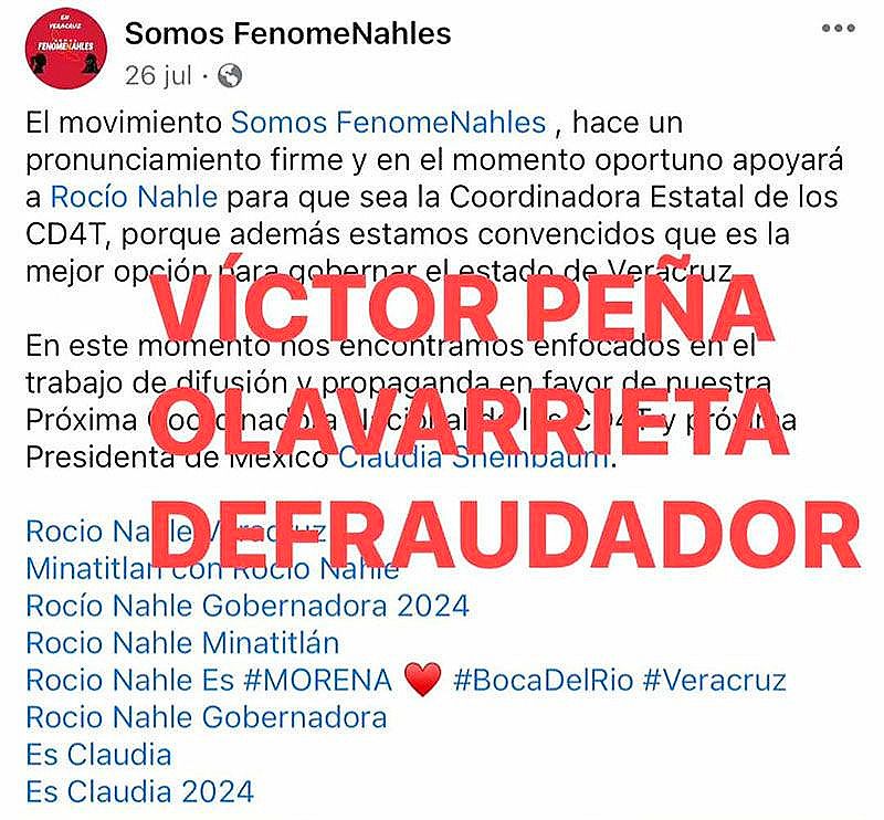 "Tanto este sujeto como su hija, se han aprovechado de la buena fe de las personas que reconocen el trabajo de Nahle García y han utilizado estas imágenes para “vender” una familiaridad y relación política inexistente", se menciona en los diversos post que los mismos morenistas han colgado en sus redes sociales.
