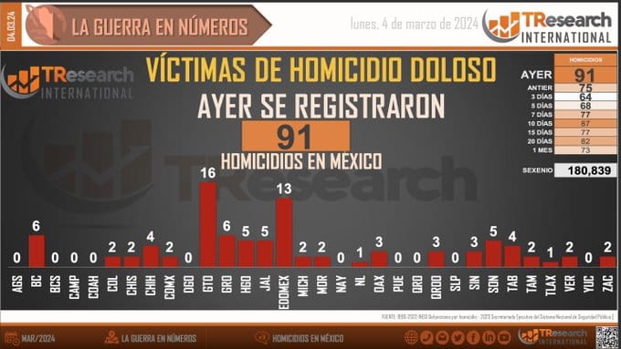 “Durante el fin de semana (1 al 3 de marzo) se registraron 230 homicidios dolosos en México. Los estados con más violencia homicida: Guanajuato 35; Edomex 24; Jalisco 16; Morelos 15; Veracruz 14; Michoacán y Baja California 12 respectivamente”, publicó la mesa de trabajo en materia de seguridad en redes sociales.