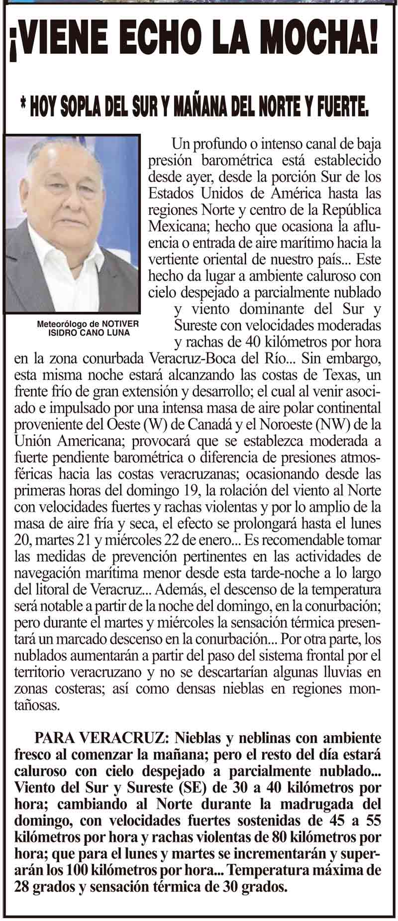 PRIMERA ¡VIENE ECHO LA MOCHA! - *HOY SOPLA DEL SUR Y MAÑANA DEL NORTE Y FUERTE. 18 enero 2025 Más Noticias ¡YA HAY TERNA! - RAÚL PEIMBERT EN LA LISTA ¡“CEMENTERIO”! - DE ULÚAS ¡INAUGURA PATY OTRA CALLE! ¡NO LE CREYERON! - Y LO BUSCAN NOTI-MEME | - ECOS DEL INFORME! ¡VERÓNICA VA CON NAHLE! - Y AL CONGRESO ¡“FAST TRACK”! - *Mientras el Mariner salía y entraba de Pajaritos en Coatzacoalcos ¡OPERATIVO LUPE-REYES! ¡MANDAN LA BILLETIZA! - *Corea manda 150 mil dólares ¡CRISTINA GANA LA ELECCIÓN!