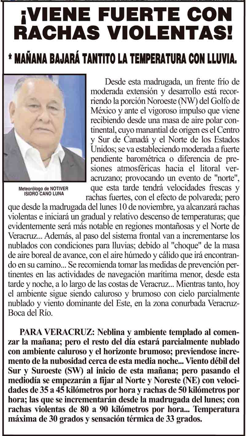 PRIMERA ¡VIENE FUERTE CON RACHAS VIOLENTAS! - *MAÑANA BAJARÁ TANTITO LA TEMPERATURA CON LLUVIA. 9 noviembre 2025 Más Noticias ¡LOS DEJARON SOLOS! - MORENA VUELVE A REVENTAR SESIÓN ¡VIENEN DESDE COLOMBIA A LA NAVAL! LOS CARTONES ¡NI MEDICAMENTOS NI UNIFORMES! - *En hospital de Boca del Río ¡SE TRAEN CUMBRE AUTOMOTRIZ! ¡REBAMBARAMBA! - MANIOBRISTAS VS. MANIOBRISTAS ¡LO HOMOLOGAN! - *El feminicidio en Veracruz ¡MEGA-CABALGATA! ¡JUSTICIA PARA BERTHA! - MARCHAS POR LA DOCTORA ¡YA HAY PLAN DE DESARROLLO!