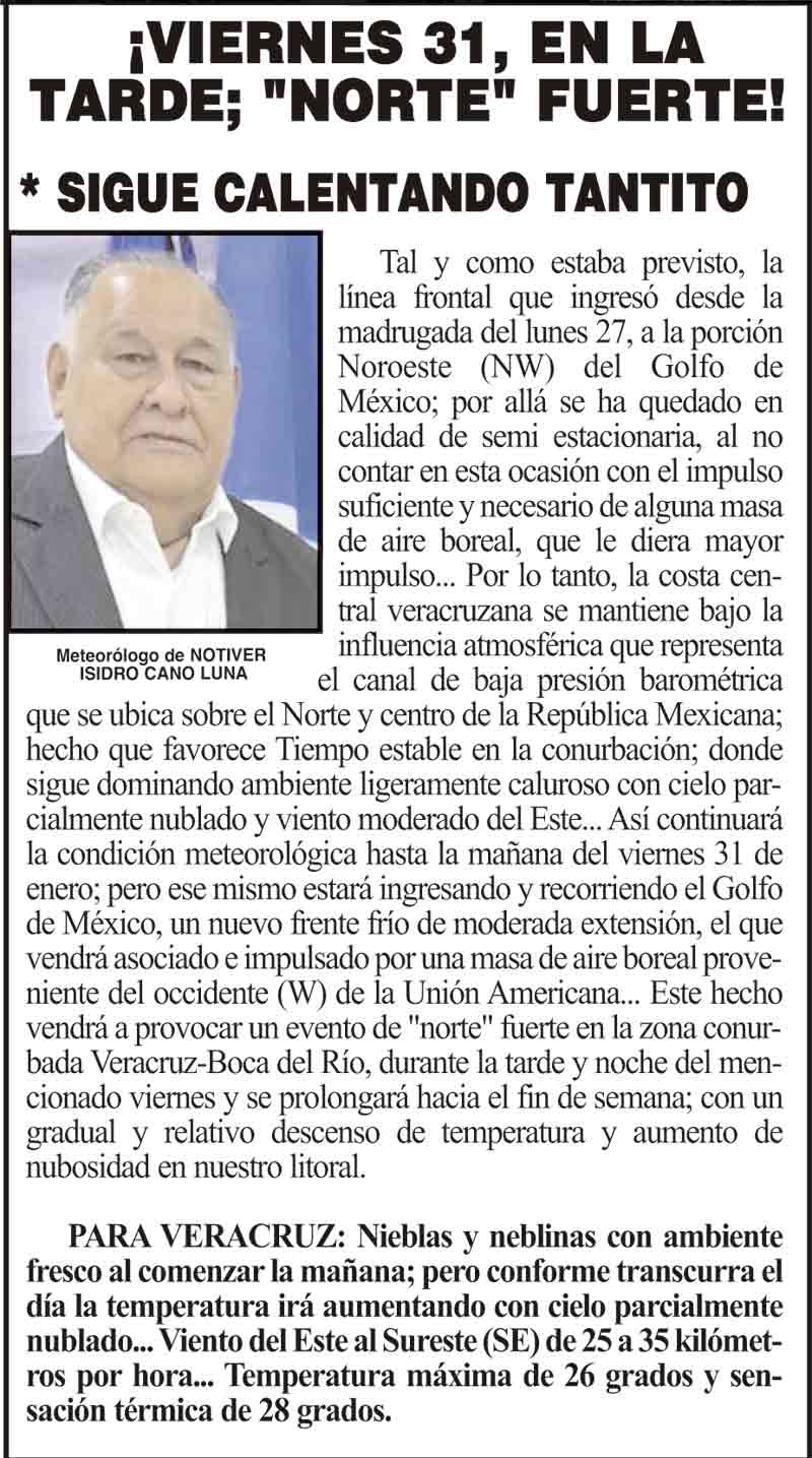 PRIMERA ¡VIERNES 31, EN LA TARDE; "NORTE" FUERTE! - *SIGUE CALENTANDO TANTITO 28 enero 2025 Más Noticias ¡YA HAY TERNA! - RAÚL PEIMBERT EN LA LISTA ¡“CEMENTERIO”! - DE ULÚAS ¡INAUGURA PATY OTRA CALLE! ¡NO LE CREYERON! - Y LO BUSCAN NOTI-MEME | - ECOS DEL INFORME! ¡VERÓNICA VA CON NAHLE! - Y AL CONGRESO ¡“FAST TRACK”! - *Mientras el Mariner salía y entraba de Pajaritos en Coatzacoalcos ¡OPERATIVO LUPE-REYES! ¡MANDAN LA BILLETIZA! - *Corea manda 150 mil dólares ¡CRISTINA GANA LA ELECCIÓN!