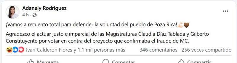 “¡Vamos a recuento total para defender la voluntad del pueblo de Poza Rica! Agradezco el actuar justo e imparcial de las Magistraturas Claudia Díaz Tablada y Gilberto Constituyente por votar en contra del proyecto que confirmaba el fraude de MC” escribió en redes.