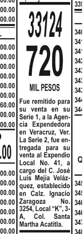 Un premio más de la Lotería cayó en este Puerto, en el sorteo del pasado viernes 17 de abril, el número ganador fue el 33124 con una bolsa de 720 mil pesos, según se advierte fue expuesto para su venta en su Serie 1 a la Agencia expendedora en Veracruz, la serie 2 fuera del Estado.