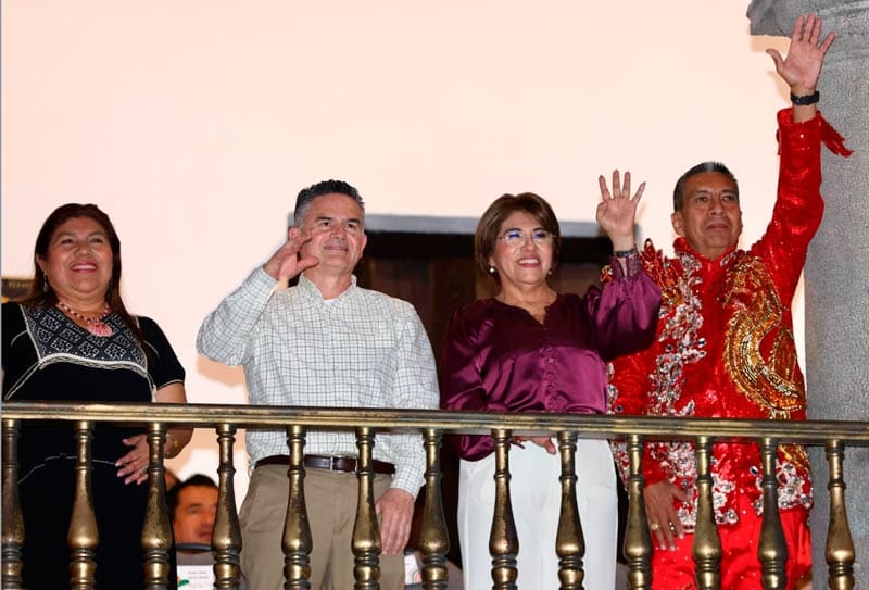 Mientras en la plancha del zócalo ardía la figura de El Bache, que dolores de cabeza hace pasar a los porteños al circular en vehículos por las calles de este puerto, en el balcón de palacio estaba la Reina del Carnaval, Fernanda Pumar, el Rey de la Alegría, Bernardo (Nayo) Jiménez, y los reyes infantiles Maryeli Sabela Torres y Gael Santiago Segura.