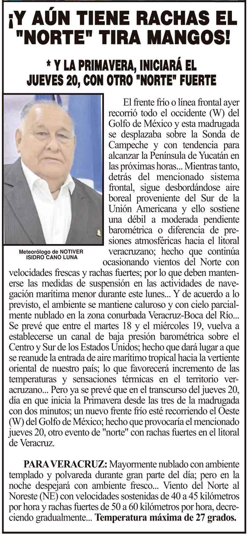 PRIMERA ¡Y AÚN TIENE RACHAS EL "NORTE" TIRA MANGOS! - *Y LA PRIMAVERA, INICIARÁ EL JUEVES 20, CON OTRO "NORTE" FUERTE 17 marzo 2025 Más Noticias ¡YA TIENE PUENTAZO EL SEGURO! ¡LA CARTELERA! | LA ÚLTIMA Y NOS VAMOS - De vacaciones andamos en Papantla, Veracruz, y en días pasados escuchamos dos charlas sobre los exploradores y la iconografía del basamento de los Nichos y El Tajín, en el Museo Teodoro Cano… ¡MAESTROS TENDRÁN BONO Y AGUINALDO! ¡LES MOCHAN EL AGUA A RÍO MEDIO! - *Por mantenimiento ¡SALE HUMO DE LAS ALCANTARILLAS! - *Explosiones en Jardines de Mocambo ¡LEY GARROTE! - *Paguen ya impuestos o van multas ¡YA TIENE MURAL TITO NIEVES! ¡PRESENTA LOTERÍA NACIONAL EL ÁLBUM DEL MUNDIAL! LOS CARTONES ¡PREVENCIONES PARA EVITAR EL INCREMENTO DE LAS INFECCIONES RESPIRATORIAS AGUADAS!