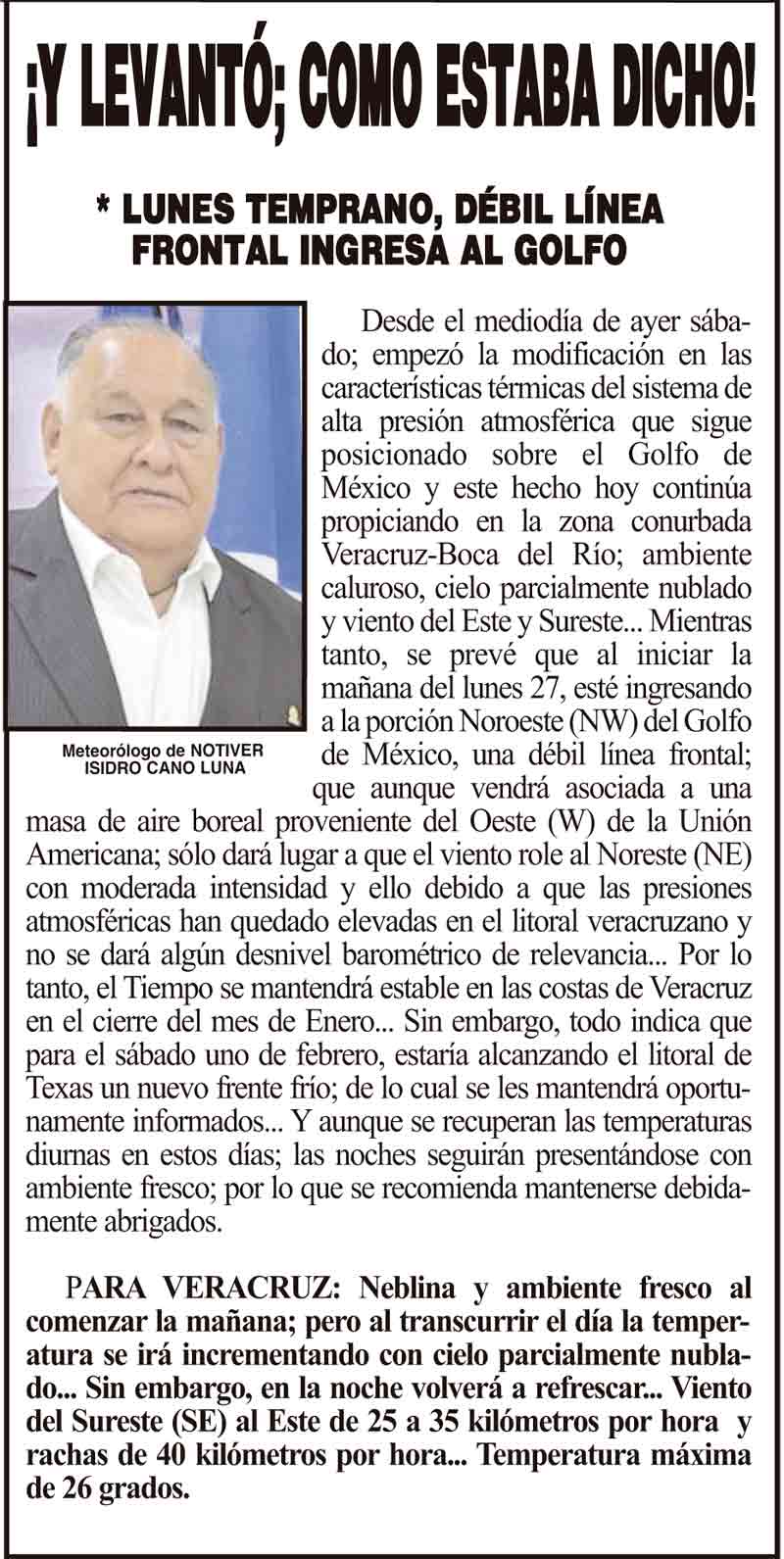 PRIMERA ¡Y LEVANTÓ; COMO ESTABA DICHO! - *LUNES TEMPRANO, DÉBIL LÍNEA FRONTAL INGRESA AL GOLFO 26 enero 2025 Más Noticias ¡YA NO FUE LO MISMO! ¡REZAN POR POZA RICA! ¡SERÁ A HUERZAS! - SIEMPRE SI ¡ESTRENA YEYA PAQUETE DE RECOMPENSAS! - YA SE SUPO EL CONCIERTO navideño... ¡CONSTERNACIÓN! - MUERE PROMESAS DEL CICLISMO ¡VAN CONTRA LA EXTORSIÓN! - VAYA ¡DENUNCIAN HECHOS DE VIOLENCIA EN CBTIS 190! ¡CONECTA LA ‘U’ A LOS VERACRUZANOS DENTRO Y FUERA DEL ESTADO! LOS CARTONES